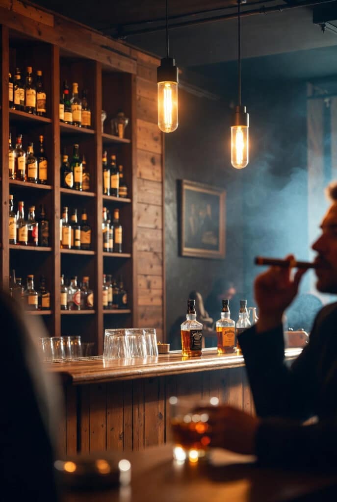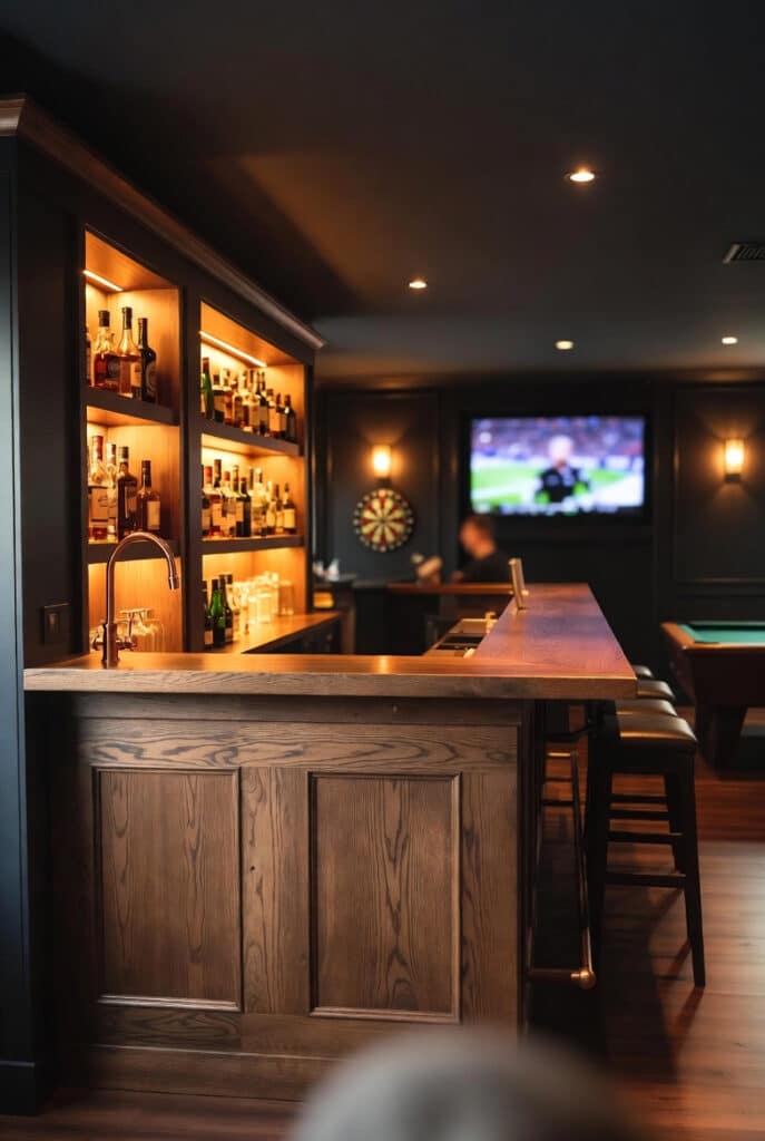 - Verlichting: dimbare spots, LED-strips of vintage hanglampen boven de bar