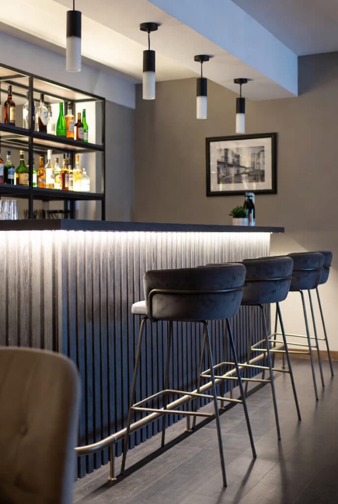Strak, minimalistisch en eigentijds. Denk aan een zwarte of antracietkleurige bar met LED-verlichting, metalen barkrukken en rustige decoratie. Meer lounge dan kroeg, met focus op design en comfort.