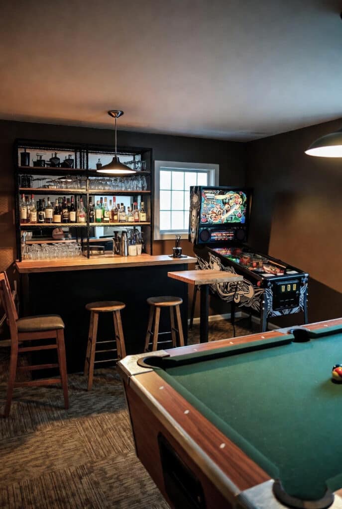 Een mancave waar spelen centraal staat. Pooltafel, neonverlichting, arcade-elementen en een bar waar je snel een drankje pakt tussen twee rondes door. Felle accenten en retro-details maken het geheel af.