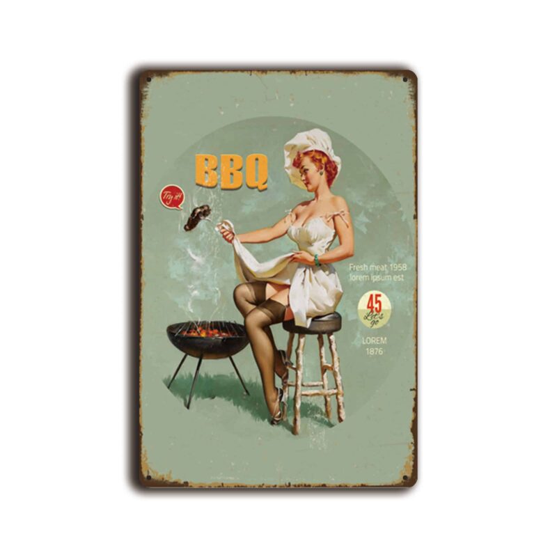 Voeg Speelse Flair Toe met het Metalen Wandbord “BBQ Pin-up Girl”