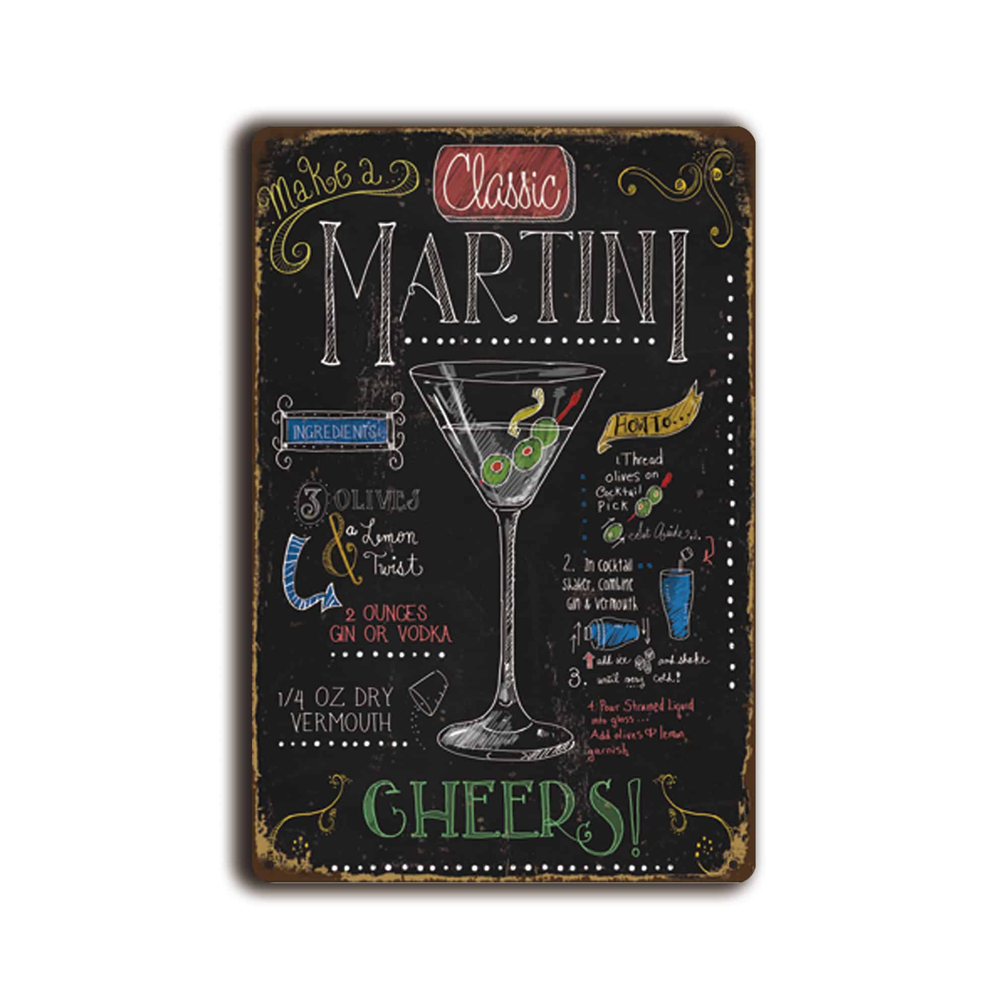 Voeg een stukje cocktailgeschiedenis toe aan je muur met het “Classic Martini Cheers” metalen wandbord, een tijdloos stuk dat elke ruimte verrijkt.