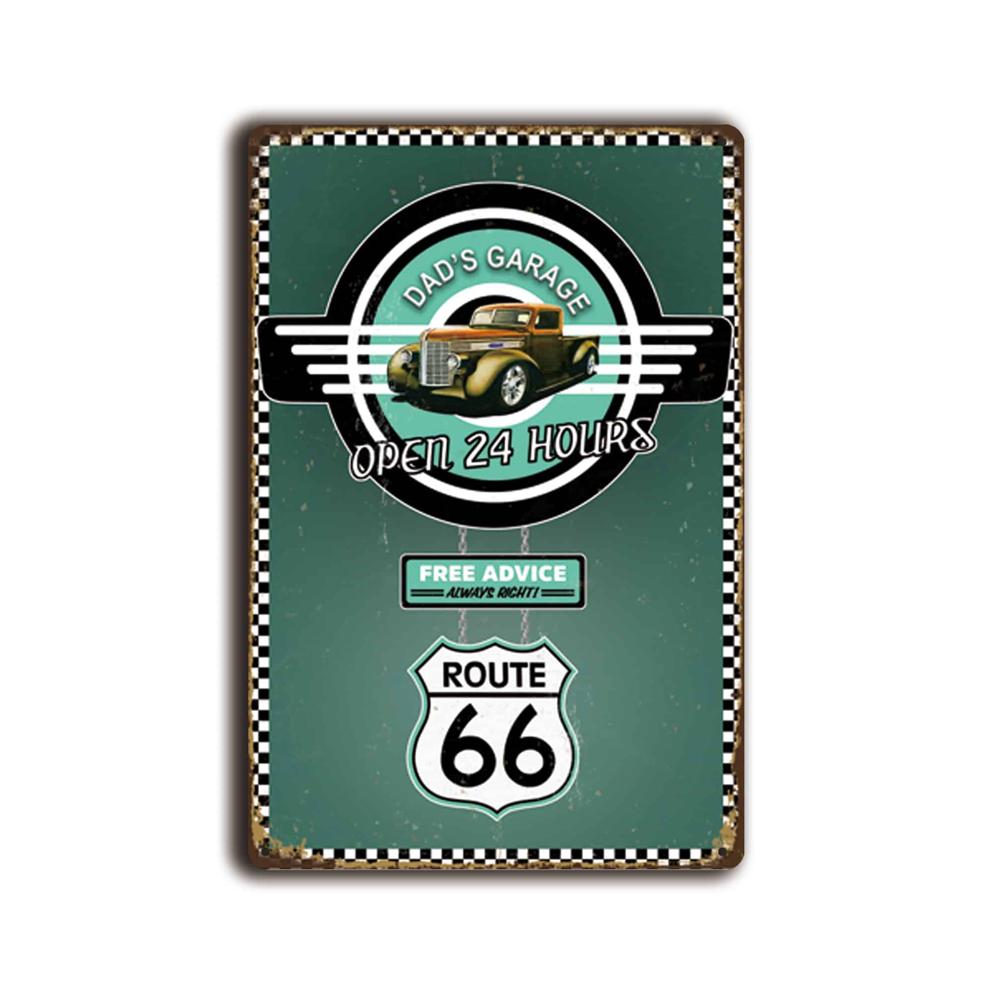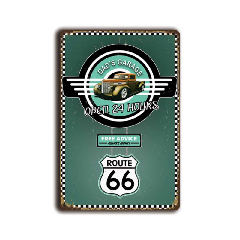 Metalen wandbord Dad’s garage open 24 hours route 66