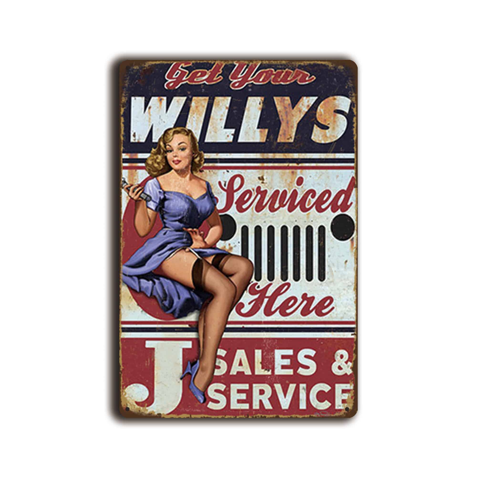 Het “Get Your Willy’s Serviced Here” wandbord is een knipoog naar de klassieke autowerkplaatsreclames uit het midden van de 20e eeuw, met een moderne twist. De afbeelding van de pin-up dame die speels haar rok optilt, voegt een ondeugend element toe dat zeker de aandacht zal trekken en voor wat gelach zal zorgen.