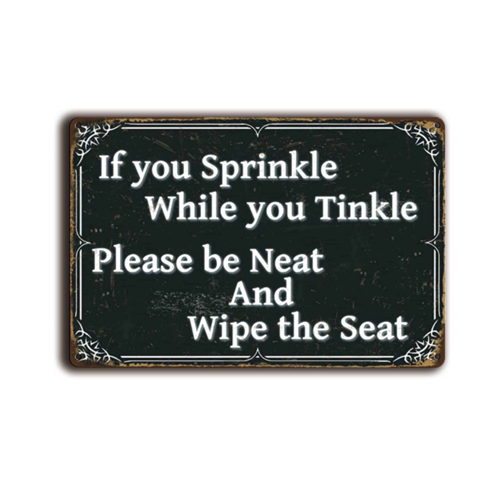 Het stijlvolle metalen wandbord “If You Sprinkle While You Tinkle. Please Be Neat And Wipe the Seat” is de perfecte aanvulling voor elke toiletruimte. Dit bord, met een retro design van zwarte achtergrond en witte tekst, combineert functionaliteit met humor om de netheid in de badkamer te bevorderen.