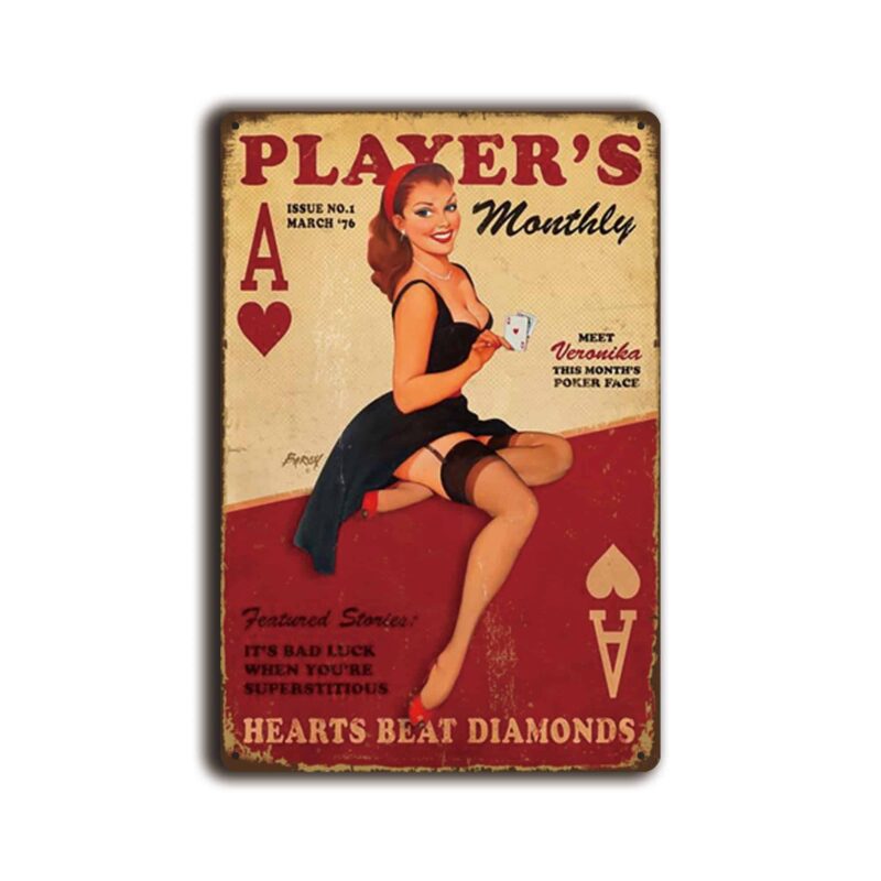 Een Verleidelijke Mix van Kunst en Spel Het “Player’s Monthly: Hearts Beat Diamonds” wandbord vangt de essentie van kaartspelen en vintage flair. De afbeelding van de verleidelijke pin-up dame, gecombineerd met het symbolische hartenaas, belichaamt de spanning en het plezier van kaartspelen. Deze elementen zijn prachtig verwerkt tegen een sfeervolle achtergrond, wat het bord tot een echte eyecatcher maakt.