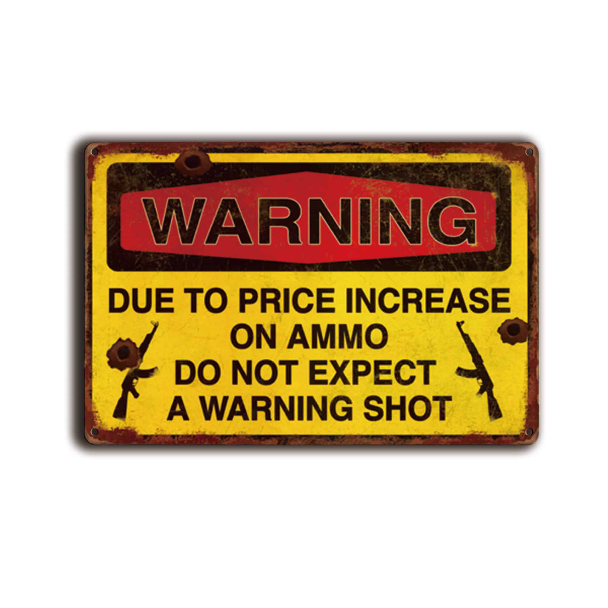 Voeg een Humoristische Waarschuwing Toe met het Metalen Wandbord “Warning: Due to Price Increase on Ammo, Do Not Expect a Warning Shot”